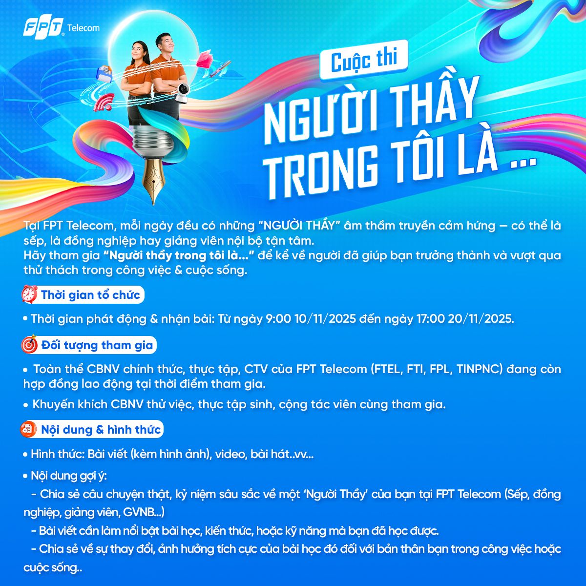 Cuộc thi được phát động và nhận bài từ 9h00 ngày 10/11/2025 đến 17h00 ngày 20/11/2025. Tất cả CBNV chính thức, thử việc, thực tập sinh và cộng tác viên của FPT Telecom (bao gồm FTEL, FTI, FPL, TINPNC) đang còn hợp đồng lao động tại thời điểm tham gia đều có thể gửi bài. Nói đơn giản, chỉ cần bạn đang là người Viễn Thông thì đều có cơ hội để kể câu chuyện của riêng mình.