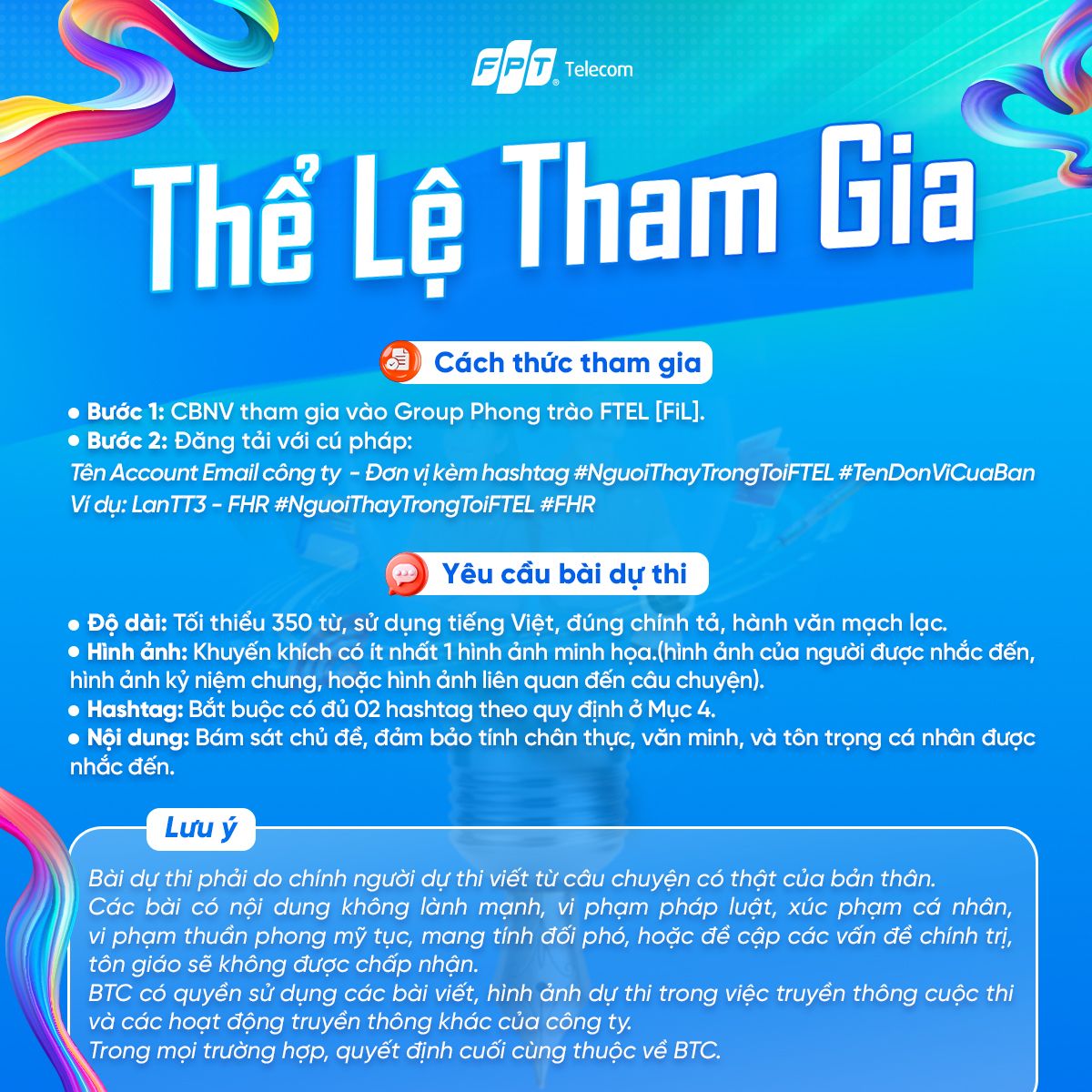 - Bài đăng bắt buộc kèm hai hashtag: #NguoiThayTrongToiFTEL và #TenDonViCuaBan.